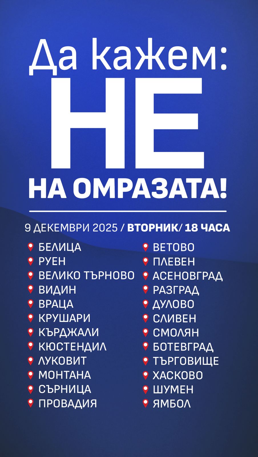 Митингите ще се проведат във вторник, 9.12. 2025 г., от 18 часа както следва :